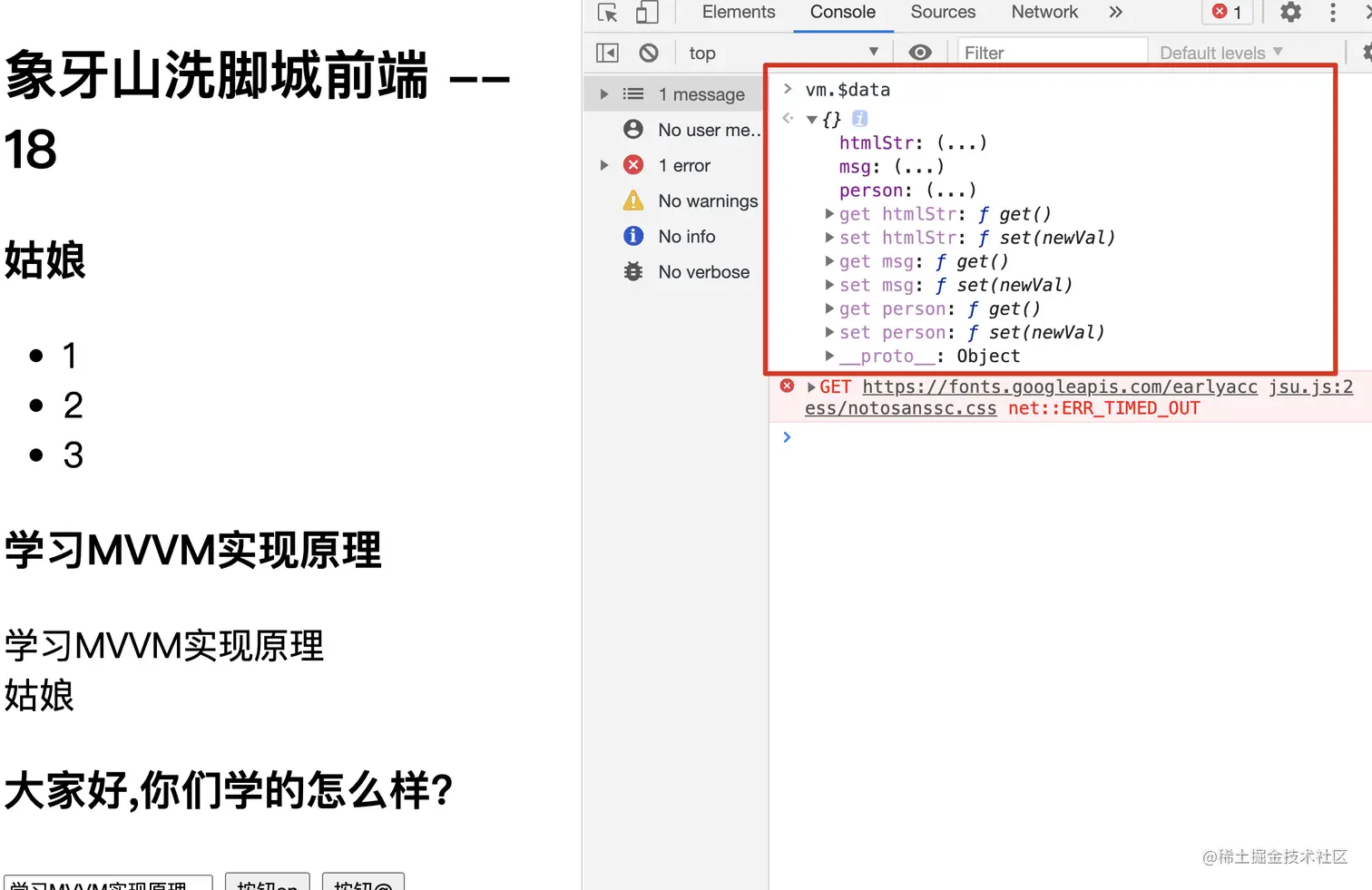 defineReactive方法写完之后可以在浏览器控制台中输入vm.$data,然后改变vm.$data中person对象的值,看看是否会出现set和get方法。