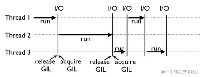 GIL 的工作原理:比如下面这张图,就是一个 GIL 在 Python 程序的工作示例。其中,Thread 1、2、3 轮流执行,每一个线程在开始执行时,都会锁住 GIL,以阻止别的线程执行;同样的,每一个线程执行完一段后,会释放 GIL,以允许别的线程开始利用资源。