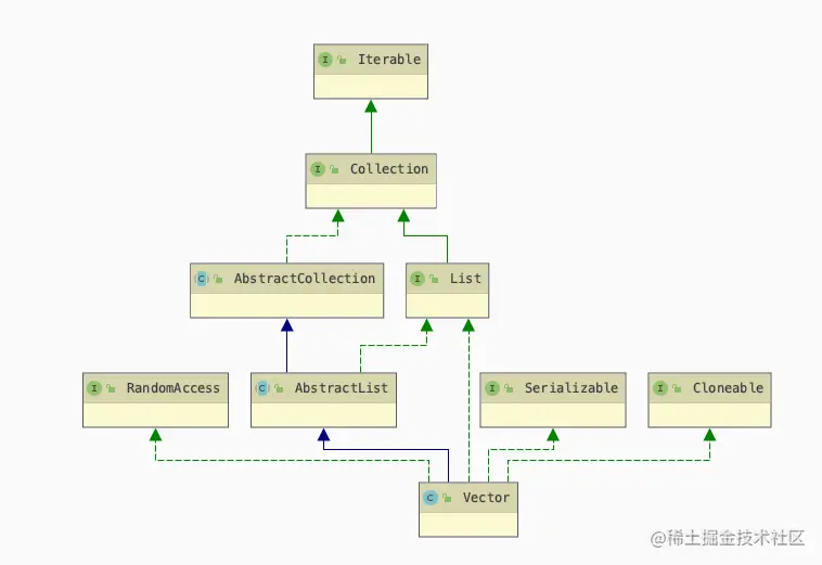 Vector和前面说的ArrayList很是类似,这里说的也是1.8版本,它是一个队列,但是本质上底层也是数组实现的。同样继承AbstractList,实现了List,RandomAcess,Cloneable, java.io.Serializable接口。具有以下特点: