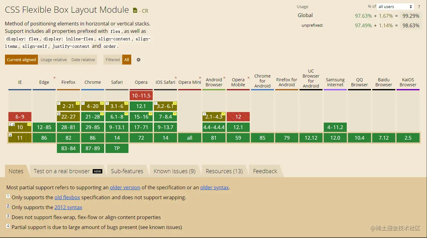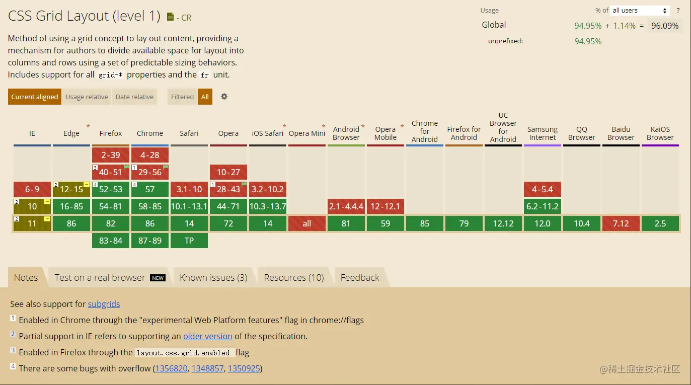 先说一下兼容性,很多人总觉得 CSS Grid 的兼容性不行。其实不然,下图的统计数据能够看出大部分浏览器对 CSS Grid 的支持还是不错的,要知道 Flex 在 IE10 上面可以使用的属性也非常有限。据统计目前 CSS Grid 使用率和 Flex 已经基本持平了。所以兼容性并不能回答开篇提出的问题。