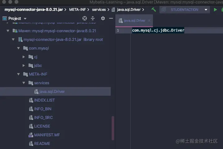 仔细一点就会发现,在我们引入的mysql包中,有一个配置文件,java.sql.Driver,里面配置了