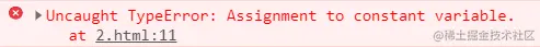const a = 10;a = 20;console.log(a); // 报错 -- 赋值给常量