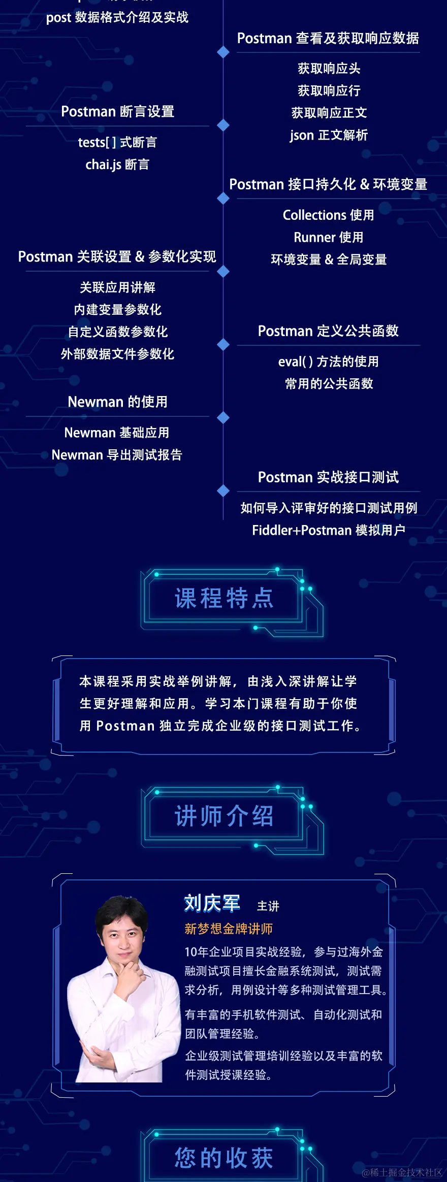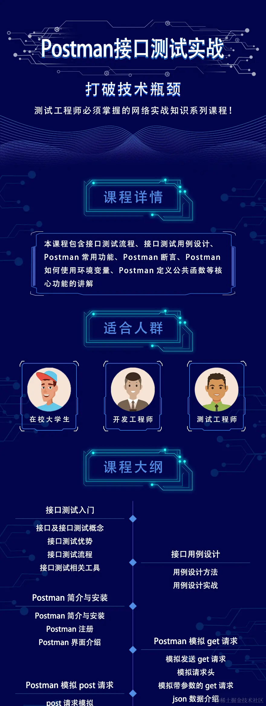 Postman接口测试实战 用户7909173417184 2020-11-08 191 阅读1分钟 网易云课堂《Postman接口测试实战》攻城狮整理发布 适用人群 在校大学生、开发工程师、测试工程师 课程概述 本课程包含接口测试流程、接口测试用例设计、Postman常用功能、Postman断言、Postman如何使用环境变量、Postman定义公共函数等核心功能的讲解。