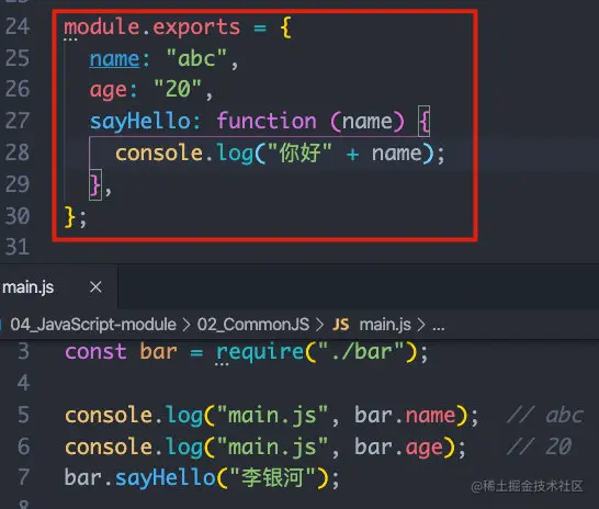 module.exports = exports = main中的bar(CommonJS内部封装);