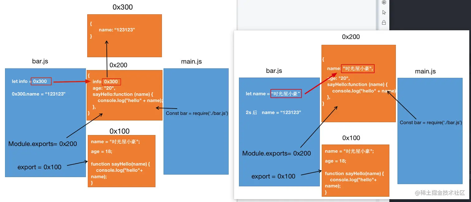 在上面代码中,只要在bar.js中修改exports对象里的属性,导出的结果都会变,因为即使真正导出的是 module.exports,而module.exports和exports是都是相同的引用地址,改变了其中一个的属性,另一个也会跟着改变。