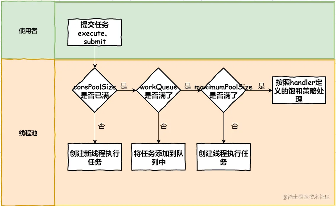 也就是说当线程池ThreadPoolExecutor执行execute或者submit方法时线程池的处理情况是这样的:
