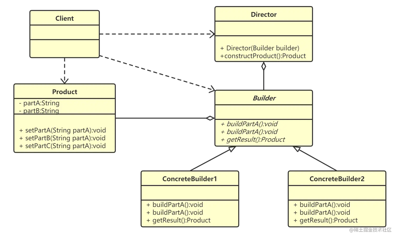 - Director(指挥者):调用建造者对象中的部件构造与装配方法,以创建一个复杂对象