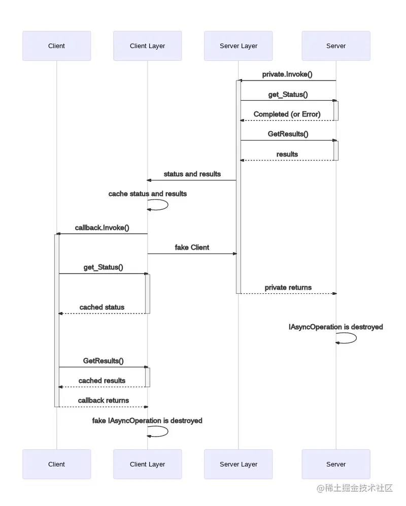 服务器调用回调来通知假客户端操作完成。假客户端立即检索状态和结果,并将两者传送给假的 IAsyncOperation,从而完成了一开始由假的 IAsyncOperation 启动的异步调用。