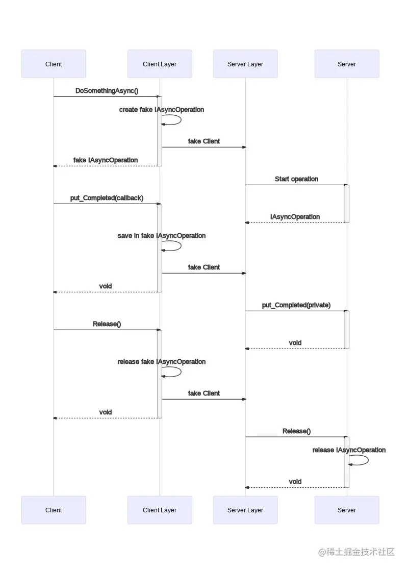 在Async-Async中,客户端对DoSomethingAsync()的调用会在客户端创建一个假的AsyncOperation。这个假的 IAsyncOperation 向服务器发出调用以启动操作,但并不等待服务器响应请求。相反,这个假的 IAsyncOperation 会立即返回到客户端。