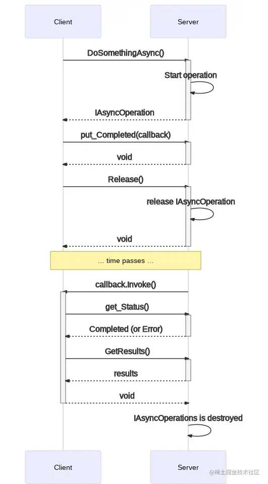 客户端调用 IAsyncOperation::put_Completed 方法来指定一个回调,该回调将在操作完成时被调用,从而允许客户端在操作完成时继续执行。服务器保存这个回调并返回。