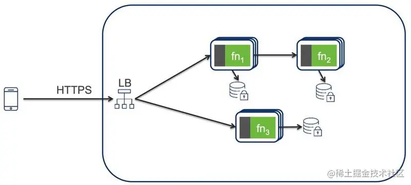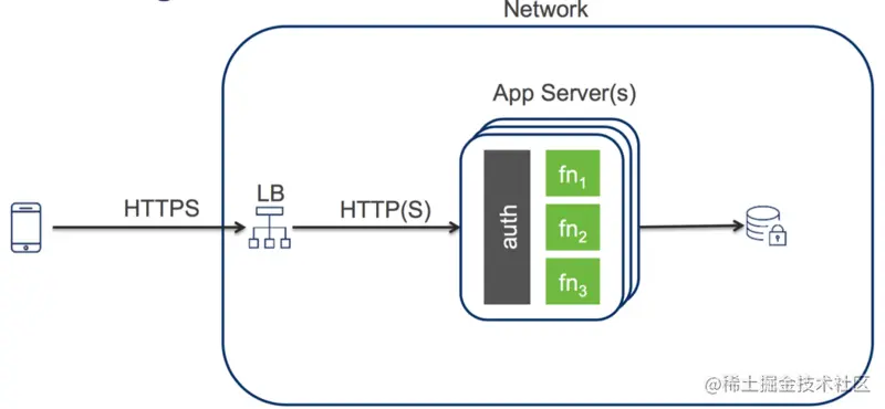 上面的示意图展示了单体应用的访问逻辑。用户通过客户端发出http或者https请求,经过负载均衡后,单体应用收到请求。
