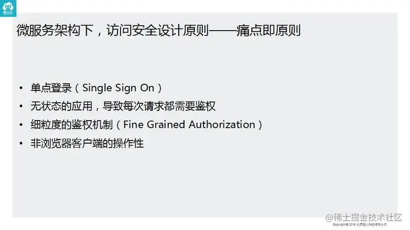 根据实际情况,还有一些其他痛点,这里不再一一赘述,而这些痛点,就形成了我们在为微服务架构设计访问安全的原则。
