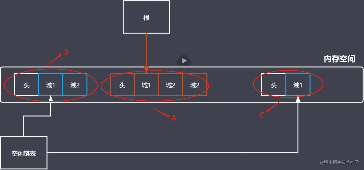 B,C区域没有标记会被垃圾回收机制清除放入空闲列表将其分配给其他内存空间利用,空间地址可以理解为和头和域组成(头公用),B有两个空间地址,C有一个空间地址,如果此时有一个D进来需要1.5个空间地址,那就不好分配,B和C被回收之后地址不连续(被A分割),缺点就是空间碎片化