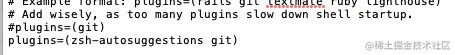 2. 用 vim(或者在根目录下找到并)打开 .zshrc 文件,找到插件设置命令,默认是 plugins=(git) ,我们把它修改为: