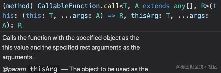 call/apply 感觉是今年手写源码最常出现的问题了,今年面试中,美团和字节各出现过一次,call/apply 的 TypeScript 稍微有点没有必要,看看官方的类型提示: