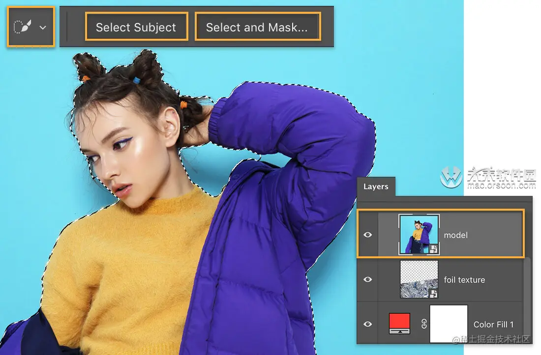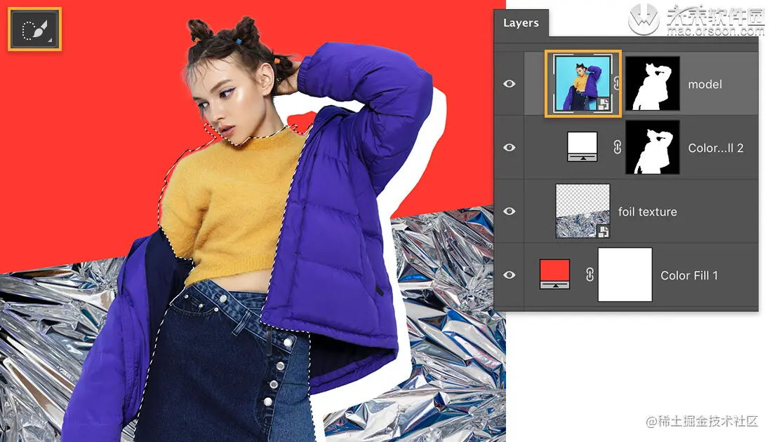 要准备剪切效果,请选择模型层,然后使用“快速选择”工具在主体上刷一下以将其选中。