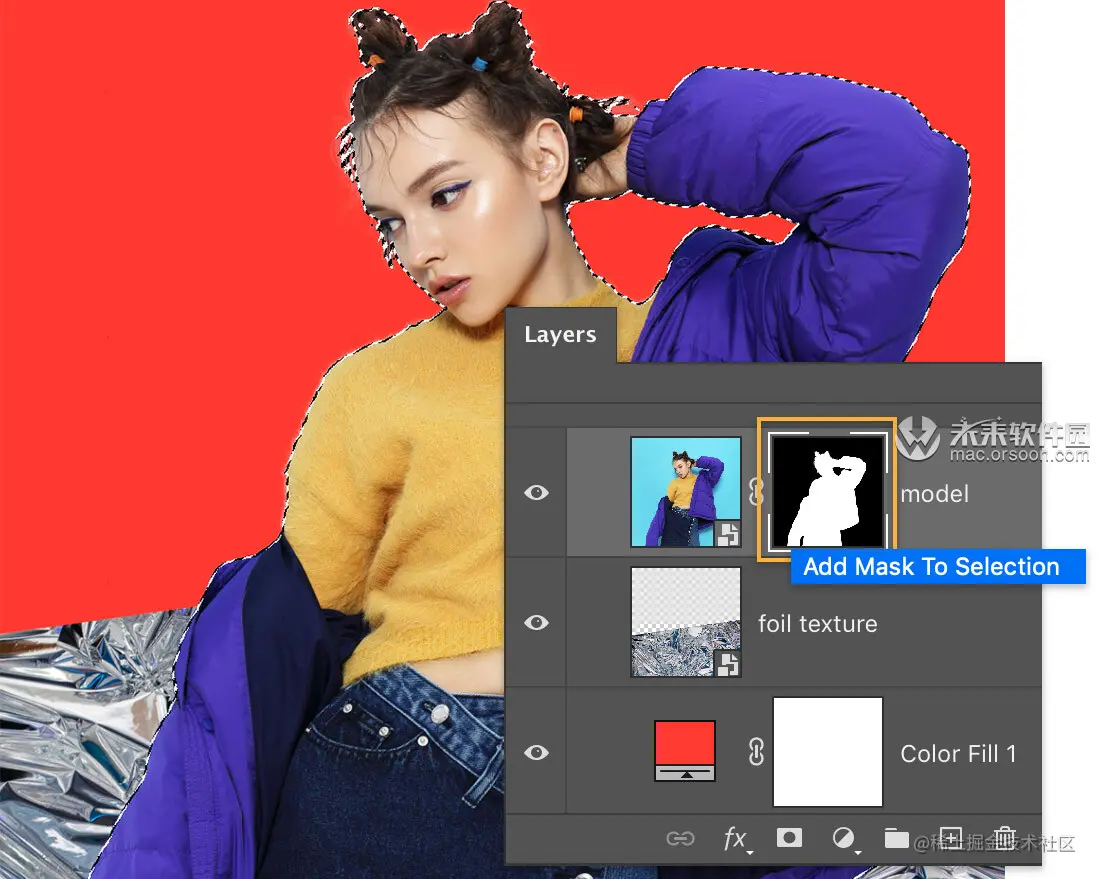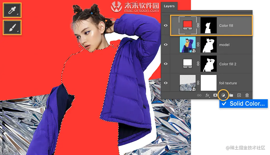 选定主体后,应用“纯色”调整层,然后使用“吸管”工具选择模型后面的红色,以便新选择与背景融合。最后,单击颜色填充层上的遮罩,选择“画笔”工具,将其设置为白色,然后沿边缘进行画笔以清理轮廓。