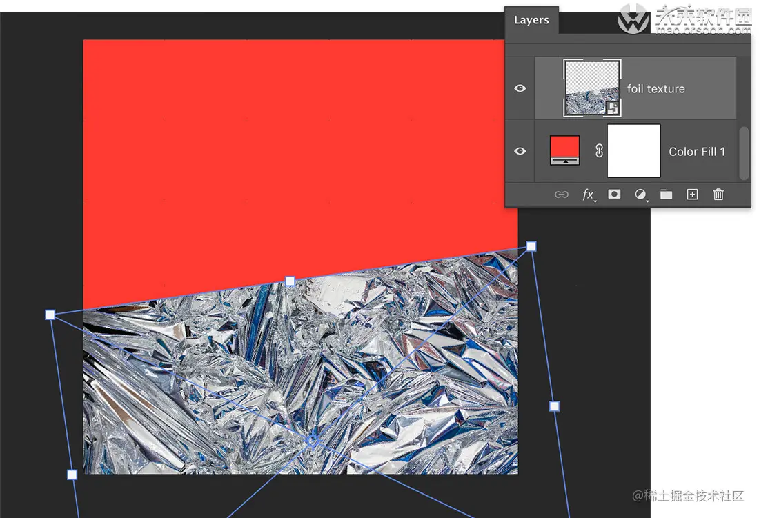 要启动项目,请将箔纹理图像拖到红色背景上。当然,您可以使用任何喜欢的纹理或背景颜色。如有必要,请拖动一个角柄以调整其大小,或者将光标保持在角柄外,然后拖动以旋转它。准备放置时,请按Enter或Return键。
