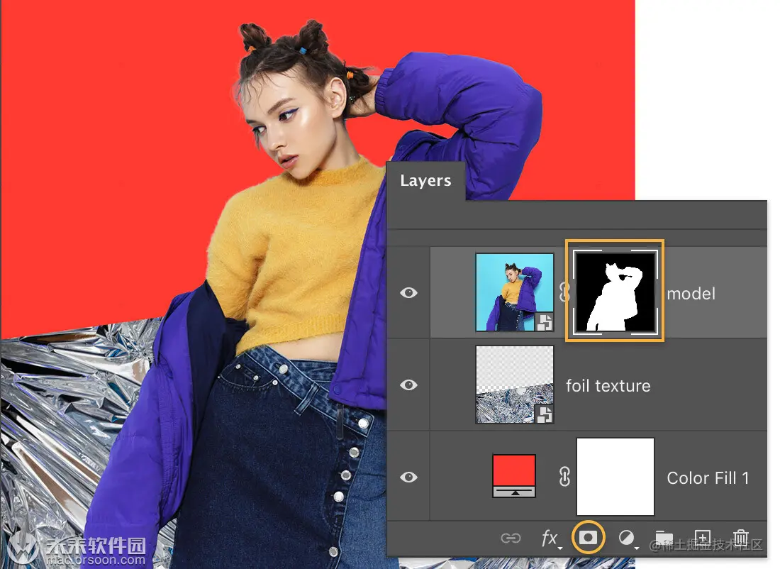 单击“图层”面板上的“添加图层蒙版”按钮,以将模型的选择转换为蒙版。这意味着您可以对其进行修改而不会影响原始图像。