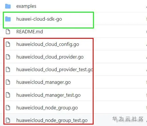 下图是华为cloudprovider插件的大致的代码结构, 绿色框里是SDK实际是对CCE(云容器引擎 CCE) 进行必要操作所需要的 (对Node Pool/Group里的Node 进行增加和删除)。 按理说我们不需要自己写这一部分,不过由于咋们云CCE 团队的SDK实在是不完善,所以我们开发了一些必要的对CCE进行操作的SDK。重点是红色框中的代码: