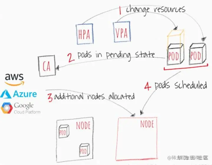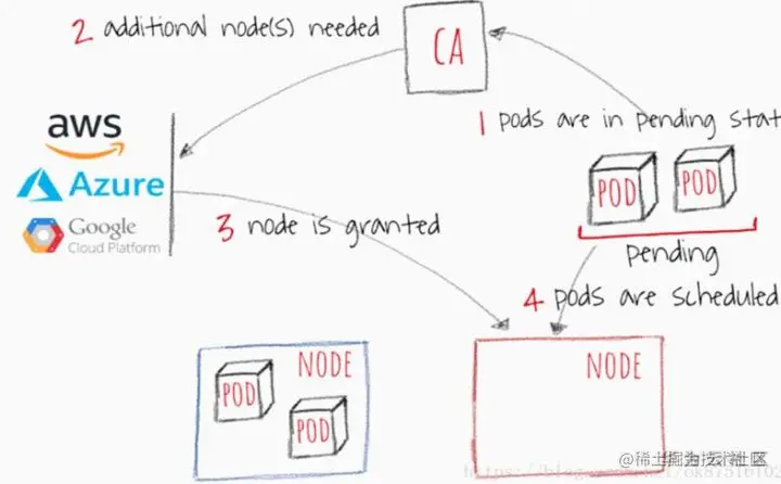如果没有足够的节点在可伸缩性事件后运行POD,则CA会扩容新的Node到集群中,之前处于Pending状态的Pods将会被调度到被新管理的node上