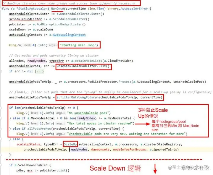 那么问题来了,合适ScaleUp和ScaleDown方法会被调用呢,咋们按照顺序一步一步来捋一下, 回到CA整体入口,那里有一个RunOnce(在autoscaler接口的默认实现static_autoscaler.go里)方法,会启动一个Loop 一直运行listen和watch系统里面是否有那些处于pending状态的Pods(i.e. 需要协助找到Node的Pods), 如下面代码片段(static_autoscaler.go里的RunOnce函数)所示, 值得注意的是,在实际调用ScaleUp之前会有几个 if/else 判断是否符合特定的条件: