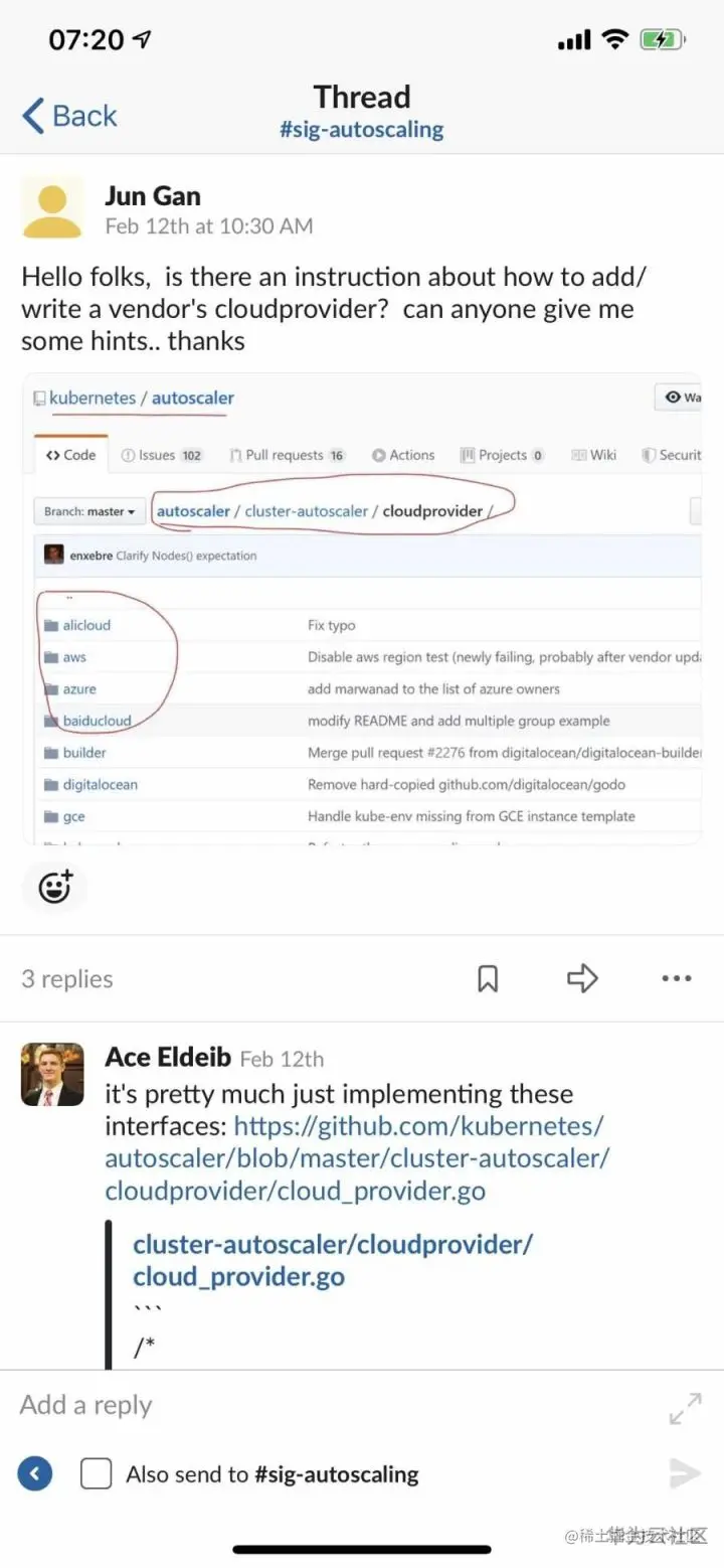 我刚开始接受该项目的时候,一头雾水,不知道该如何下手。K8s关于这一块的文档写的又不是很清楚。以往的经验以及K8s Github README中提供的信息,我加入他们的Slack组织,找到相应的兴趣组channel( 对应我的情况就是sig-autoscaling channel),提出了我的问题(如下面截图)。 基于K8s代码仓的大小,如果没找到合适的扩展点,几乎无法改动和扩展的。