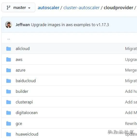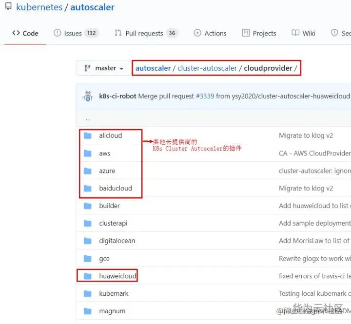 基于业务团队(Cloud BU 应用平台)在开发Serverless引擎框架的过程中完成的K8s Cluster Autoscaler华为云插件。 目前该插件已经贡献给了K8s开源社区,见下图: