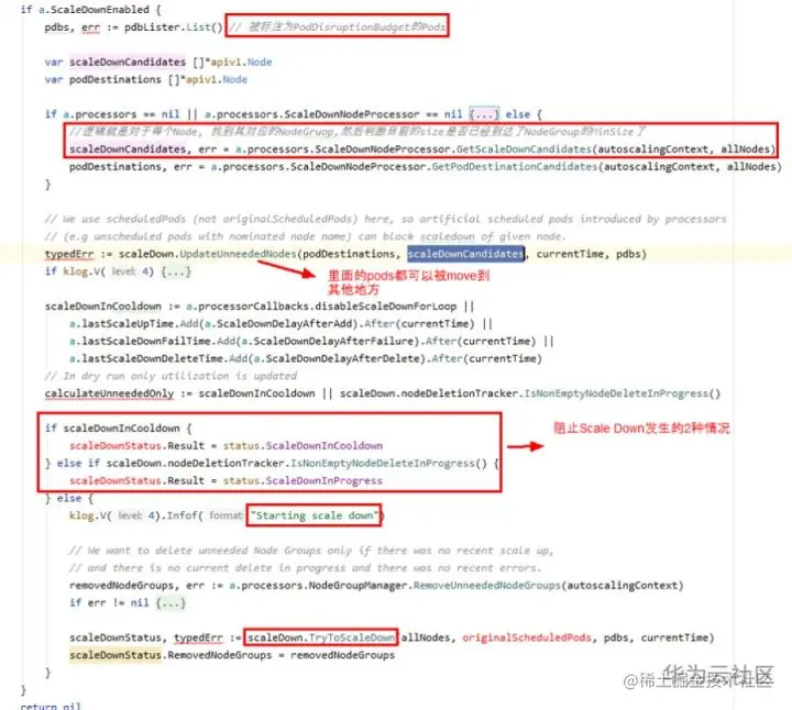 对于ScaleDown函数的调用,同理,也在RunOnce函数里, ScaleDown主要逻辑是遵循如下几步: