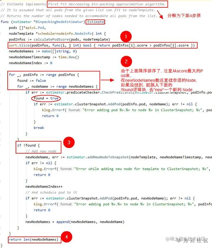 把第1步得到的所有可用的NodeGroups和第2步得到的待分配的Pods, 作为输入,送入给estimator子模块的装箱算法(该调用发生对上图中computeExpansionOption函数调用内部) ,得到一些候选的Pods调度/分配方案。由于estimator子模块的核心就是装箱算法,下图就是实现了装箱算法的Estimate函数,这里实现有个小技巧,就是算法开始之前,先调用calculatePodScore把两维问题降为一维问题(即Pod对CPU和Memory的需求),然后就是传统的装箱算法,两个for loop来给 Pods找到合适的Node. 至于具体如何降维的,详见binpacking.estimator.go里的calculatePodScore函数源码。