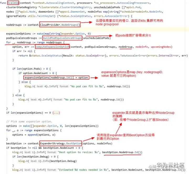 在扩容时候:其ScaleUp函数会调用estimator模块来评估所需节点数
