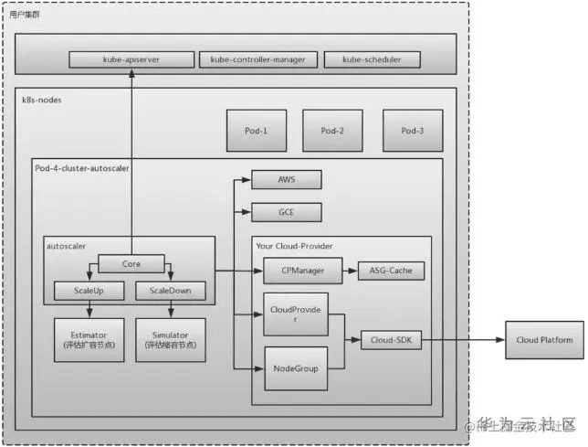 - autoscaler通过该模块与具体云提供商对接(如上图右下角方框所示 AWS, GCE等云提供商),并可以调度每个云提供商提供的Node.