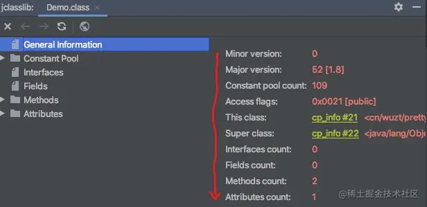 import java.util.Arrays; import java.util.Iterator; import java.util.List; public class Demo { public Demo() { } public static void main(String[] args) { System.out.println("-------------------foreach语法糖---------------------"); List<Integer> list = Arrays.asList(1, 2, 3, 4); int sum = 0; int i; for(Iterator var3 = list.iterator(); var3.hasNext(); sum += i) { i = (Integer)var3.next(); } System.out.println(sum); System.out.println("-------------------自动装箱拆箱---------------------"); Integer a = 1; Integer b = 2; Long c = 3L; System.out.println(c == (long)(a + b)); System.out.println("-------------------条件编译---------------------"); System.out.println("yes"); } }- Demo.class(借用idea jclasslib插件进行查看 开头是cafebabe常量,如下信息详细用法请查阅深入理解java虚拟机第6章)