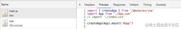 先看看两张对比图, 图一是项目文件中我们手写的main.js, 经过vite的模块重写,