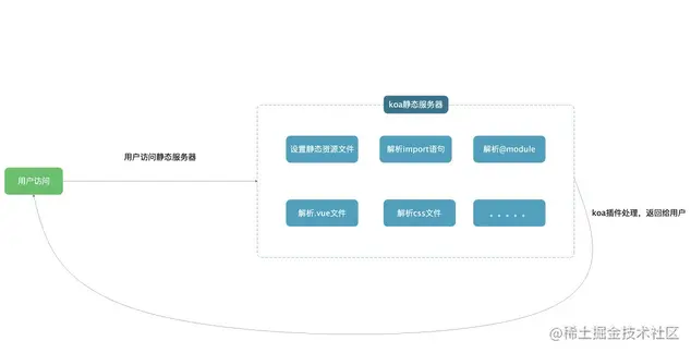 通过此流程图可得: vite是借助了node的koa模块,启动一个静态服务器,通过Koa的中间件, 完成了设置静态资源文件, 解析import语句,解析@module模块,解析vue文件等功能, 本文讲会带领大家手写一个toyVite, 完成上述类似的功能。