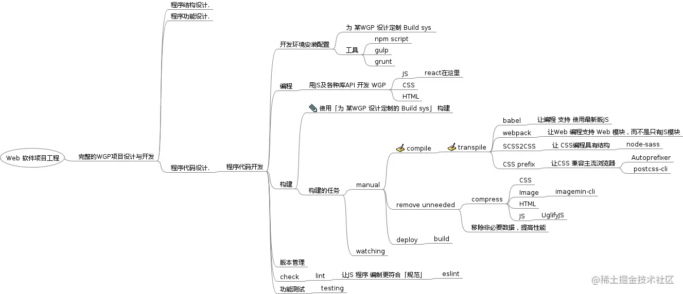 从这个前端项目工程“脑图”可看出来,「JS编程」只是前端「程序代码开发」任务的一项,并列还有构建,版本管理,功能测试等任务;而「程序代码开发」又是前端工程中的一项,并列还有程序功能设计(需求分析)和结构设计(架构设计)等。
