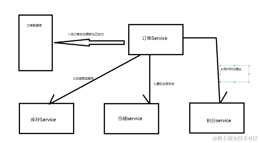 用户针对一个订单完成支付后,就回去找订单服务,更新订单状态