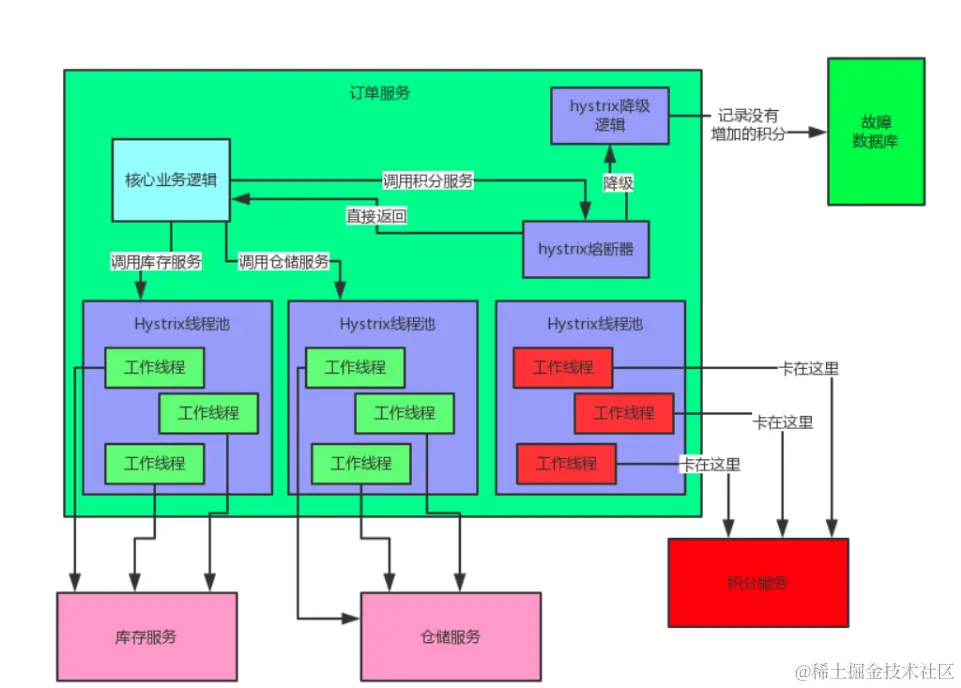 如果积分服务出错,每次订单服务调用积分服务的时候,都会卡住几秒钟,然后抛出—个超时异常
