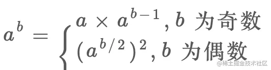 但是有的读者可能会问,这个求幂的算法就这么简单吗,直接一个 for 循环累乘就行了?复杂度会不会比较高,有没有更高效地算法呢?