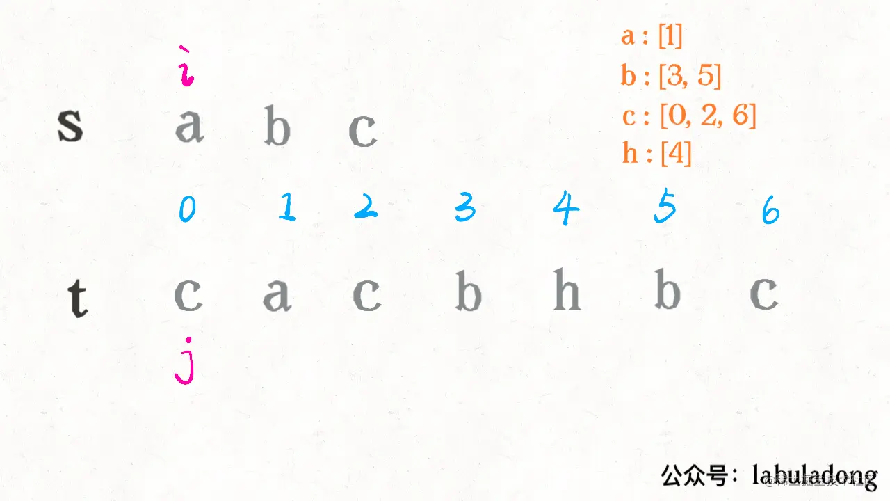 // 先记下 t 中每个字符出现的位置