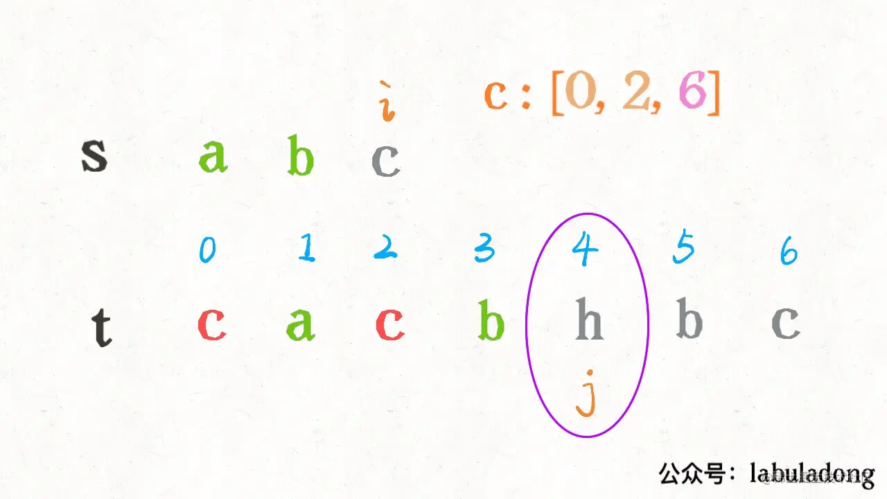 按照之前的解法,我们需要 j 线性前进扫描字符 "c",但借助 index 中记录的信息,可以二分搜索 index[c] 中比 j 大的那个索引,在上图的例子中,就是在 [0,2,6] 中搜索比 4 大的那个索引:
