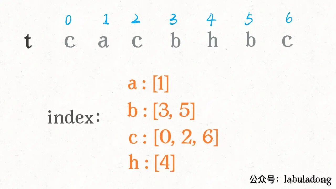 二分思路主要是对 t 进行预处理,用一个字典 index 将每个字符出现的索引位置按顺序存储下来: