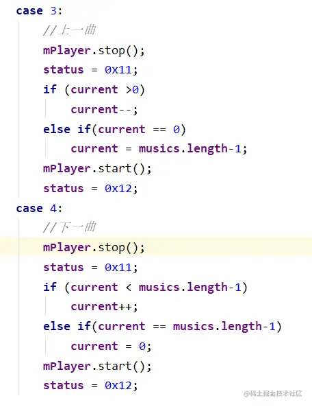 这个上下曲切换的功能写的不好。因为只有三首音乐,所以else if中的2很容易想到。可如果开发成APP,用户肯定会向列表中添加歌曲,因此肯定不能简单地填2。修改后如下: