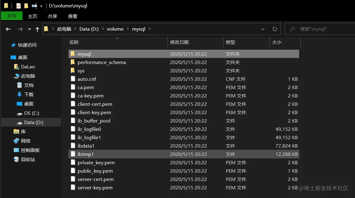 这样容器内的 /var/lib/mysql 目录映射到了宿主机的D:/volume/mysql目录上,容器没了数据还在