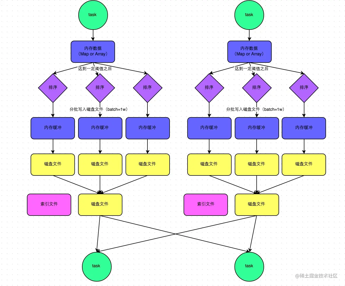 MapReduce的shuffle是一种通用的shuffle(每一个task最终都只会形成一个磁盘文件加一个索引文件,而且还会给我们进行排序)
