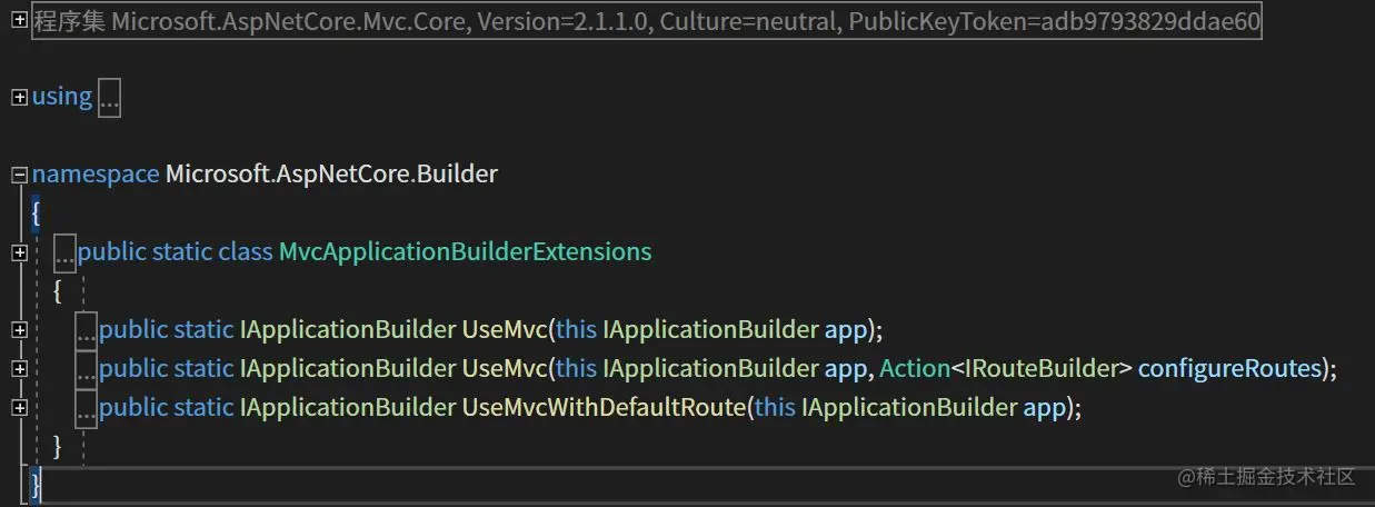 除了IApplicationBuilder的UseRouter方法外,在添加MVC中间件时使用的UseMvc方法也可以配置路由信息,以下是UseMvc的方法签名: