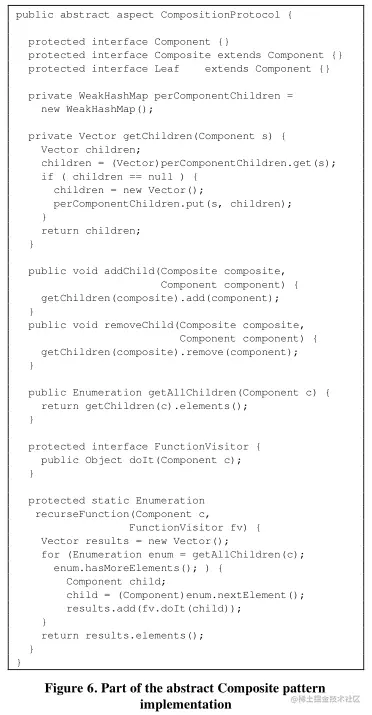 类似于观察者模式,这些模式引入了不需要客户端可访问接口的角色,并且只在模式中使用。在AspectJ中,这样的角色是用空的(受保护的)接口实现的。它们引入的类型在模式协议中使用。每个模式的一个抽象方面定义了角色,并在可能的情况下附加了默认实现(参见图6的部分抽象组合方面)。