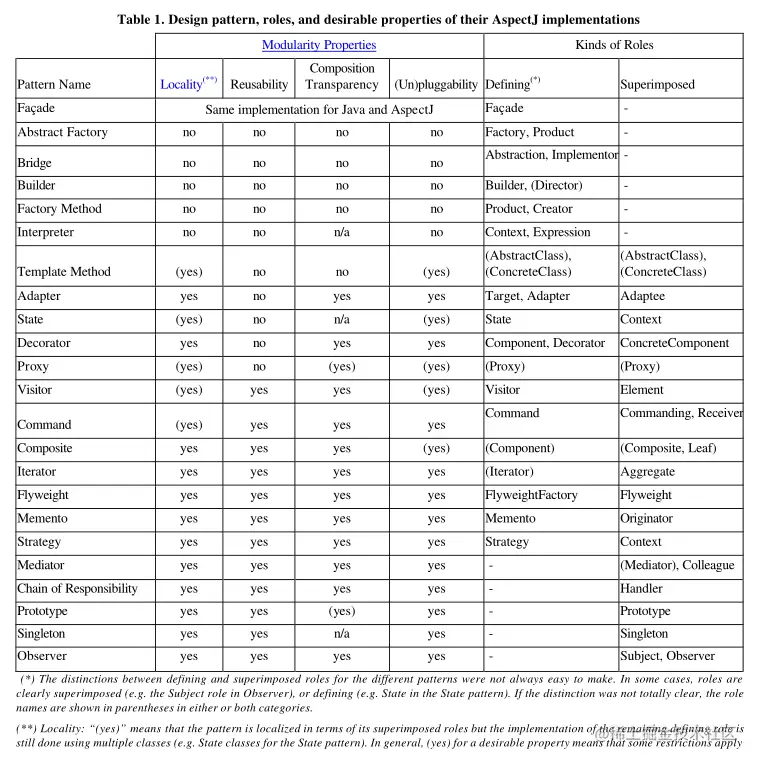 23个GoF模式中的17个的AspectJ实现是本地化的。对于其中的12个,局部性使得实现的核心部分能够被抽象成可重用的代码。在17个中的14个中,我们观察到了模式实例的透明可组合性,因此多个模式可以有共享的参与者(见表1)。