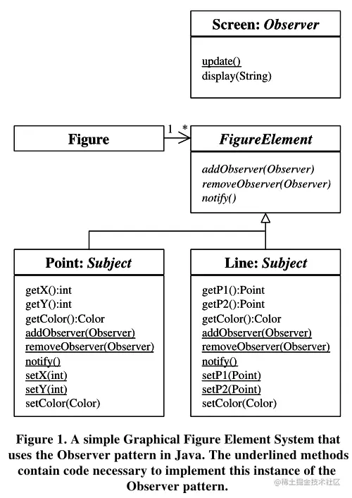 考虑一个简单图形包中观察者模式的具体例子,如图1所示。在这样的系统中,观察者模式将被用来使图形元素的突变操作更新屏幕。如图所示,实现这种模式的代码分布在各个类中。