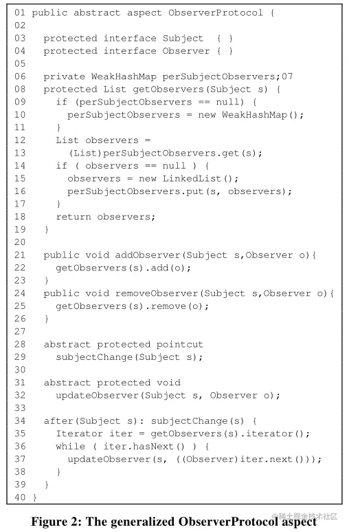 AspectJ代码中映射的实现被本地化为ObserverProtocol方面。它是通过使用链表的弱散列映射来存储每个主题的观察者来实现的(第6行)。由于每个模式实例都由ObserverProtocol的一个具体子方面表示,因此每个实例都有自己的映射。